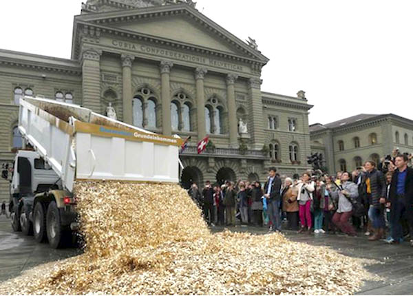 Để tiện so sánh, người lao động ở Mỹ kiếm được trung bình 3.769 USD/tháng trước thuế trong năm 2011. Cùng thời điểm, lao động trong ngành công nghiệp dịch vụ thực phẩm có thu nhập chỉ 1.785 USD. Hãng tin MSN nói rằng trong nỗ lực thể hiện sự ủng hộ kiến nghị, người dân Thụy Sĩ đã lái một chiếc xe tải chở 8 triệu đồng 5 xu tới đổ tại thủ đô Thụy Sĩ. Mỗi đồng xu này đại diện cho một công dân của đất nước.